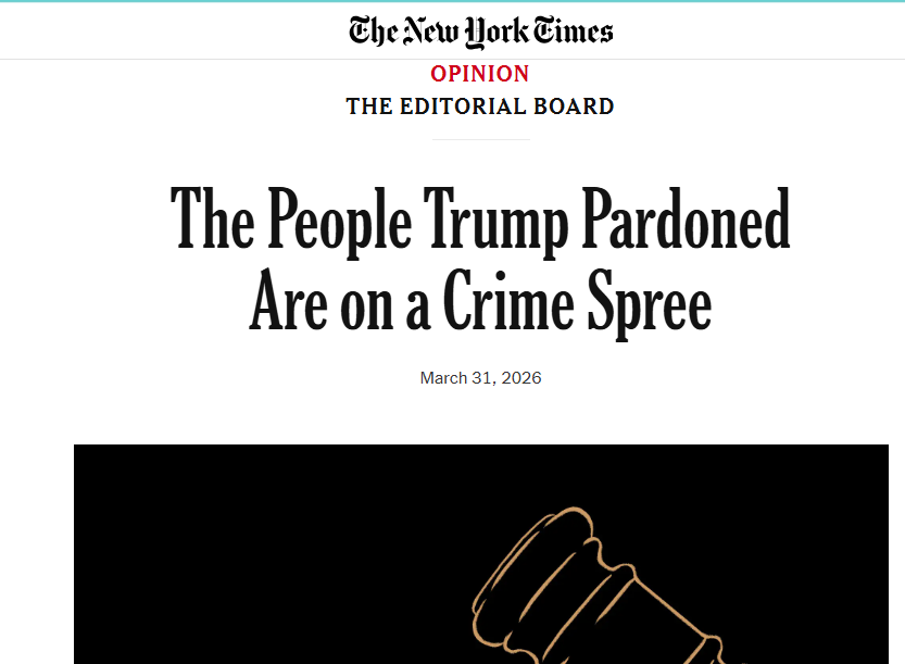 SHAME ON THE NEW YORK TIMES!!! On March 31, 2026 the NYT Editorial Board unleashed an opinion piece overloaded with smears against former January 6 defendants. This op-ed will go down as one of the most deceptive in history. NYT says “at least twelve” (of 1,500) J6ers have been “charged” with new crimes since being pardoned. This includes protest-related vandalism, a “brief detention” for scuffling with protestors at a press conference. violating a family court order and resisting arrest. That’s an arrest rate of EIGHT-TENTHS OF ONE % per year (actually 14 months) for J6ers.